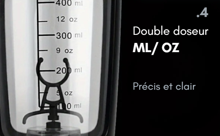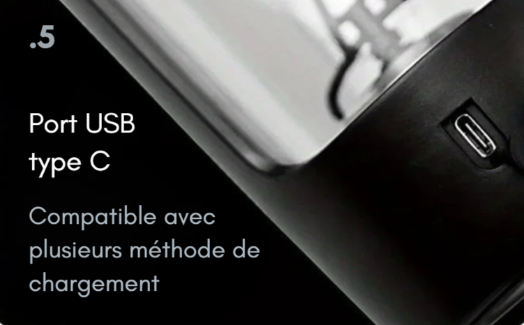 Notre shaker a une capacité de 650 ml, ce qui est parfait pour préparer des portions individuelles de vos boissons protéinées. Il est équipé d'une batterie de 1200 mAh, qui vous permet de l'utiliser plusieurs fois avant de devoir le recharger. Le shaker est fourni avec un câble USB-C, pour un chargement rapide et pratique avec n'importe quel adaptateur compatible.